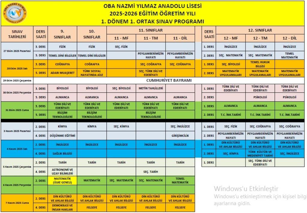 1. Dönem 1.Ortak Sınav Programı Yayınlandı